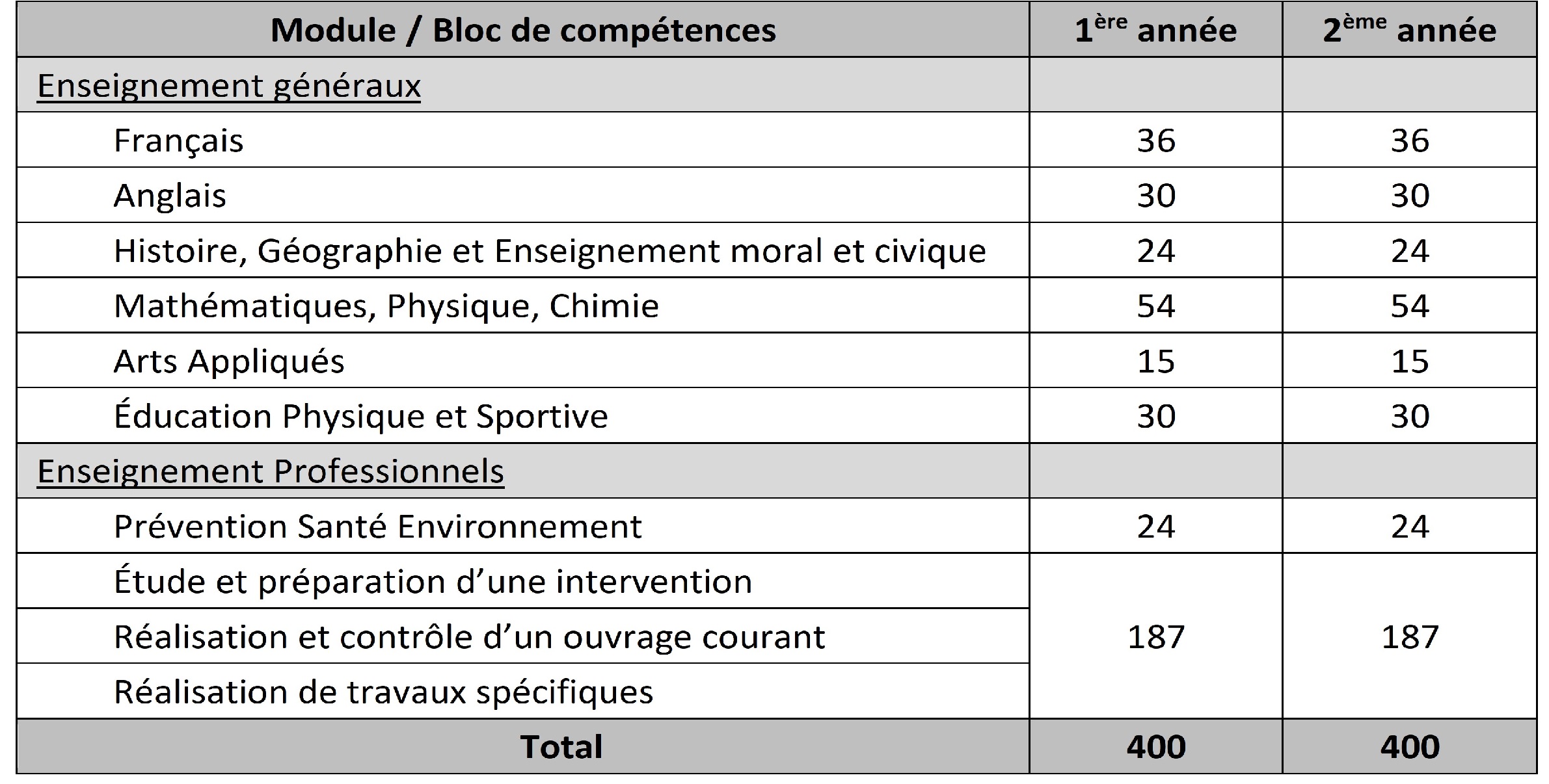 La formation s’étend sur deux années scolaires pour une durée de 800 h en centre de formation.