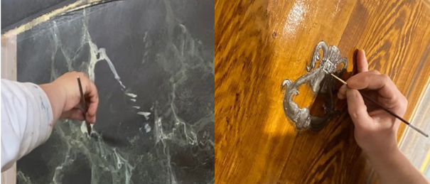 Outre la pose de revêtements spécifiques (peinture…), il réalise des finitions décoratives : imitation de marbres, de bois, trompe-l’œil, application de dorure, etc.
